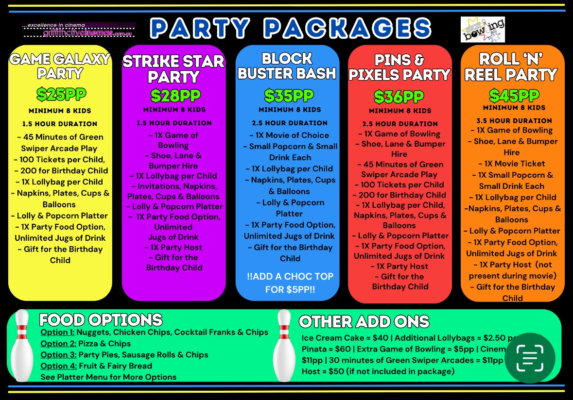 Check out the great birthday options at Griffith City Cinemas, Star Bowling and Family Funland below. For further information or to schedule a booking, please call 6964 3102 or email us.